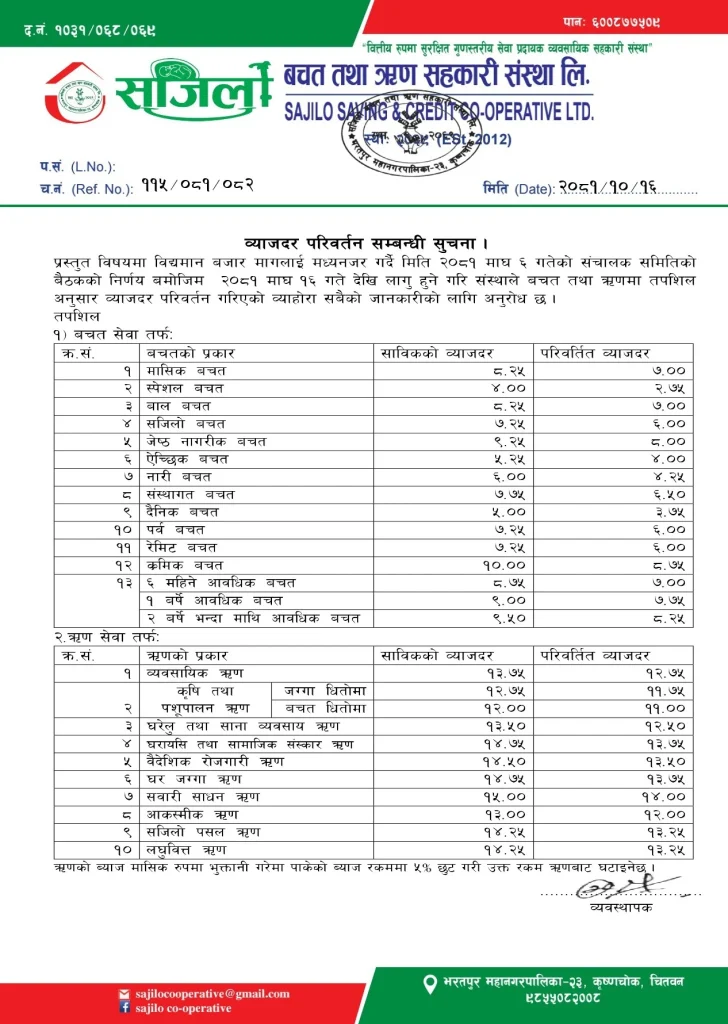 व्याजदर परिवर्तन सम्बन्धि सूचना ।