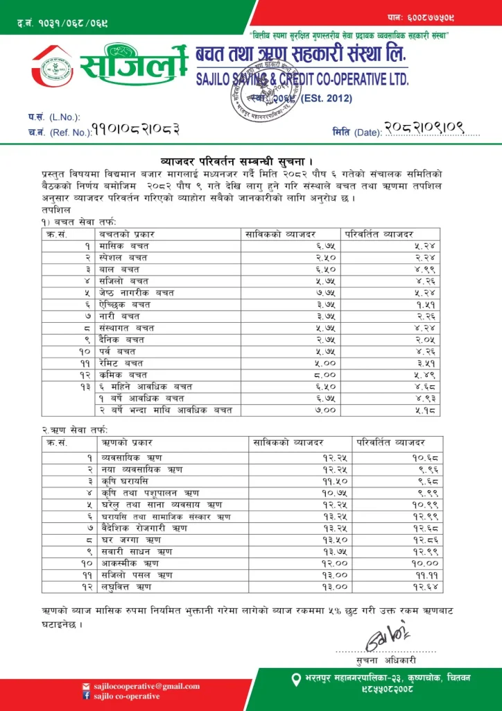 व्याजदर परिवर्तन सम्बन्धि सूचना ।